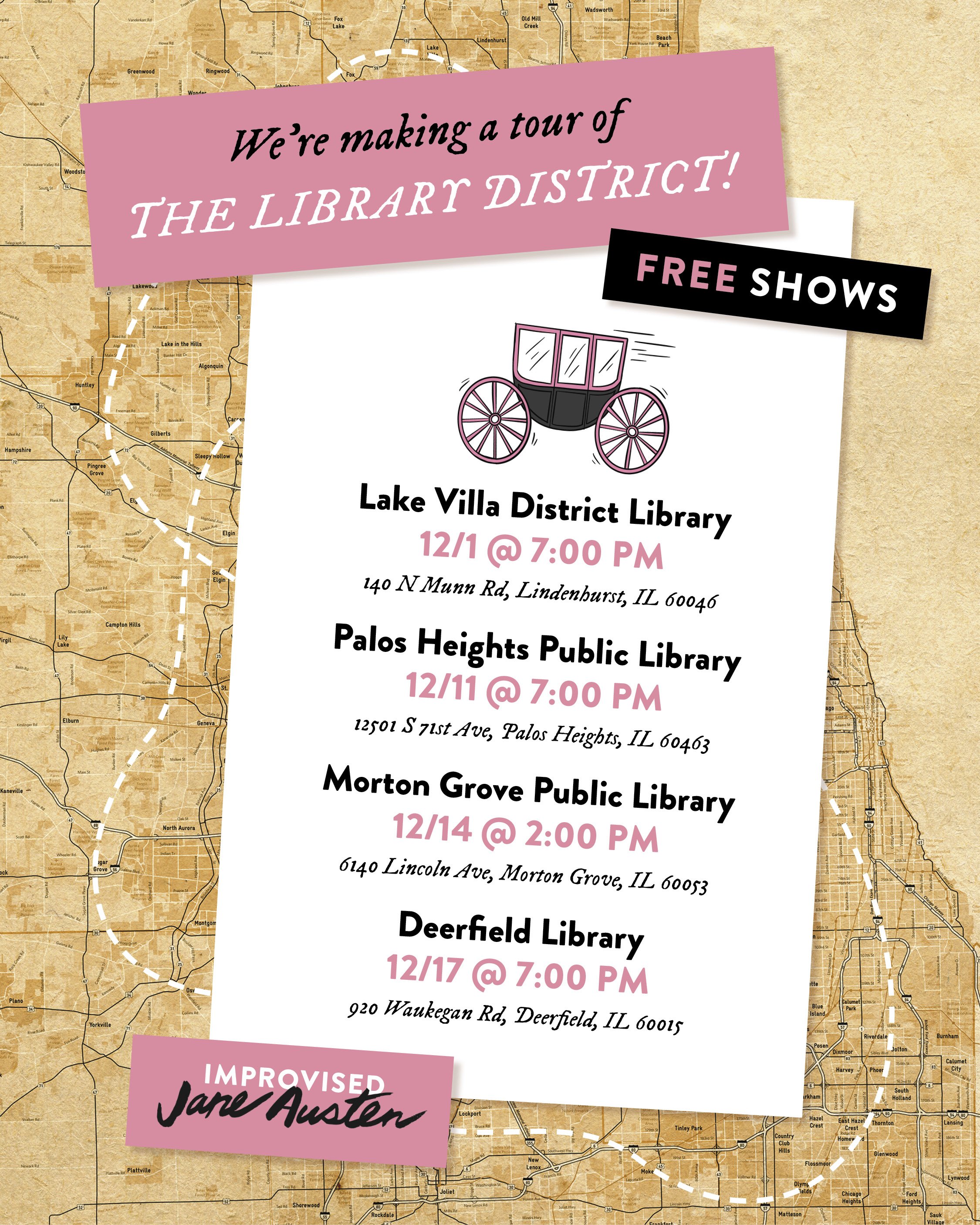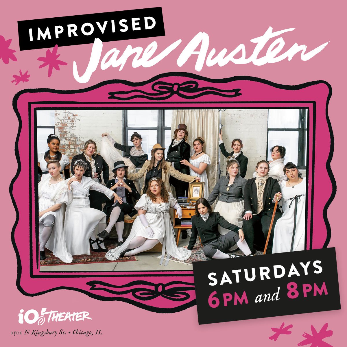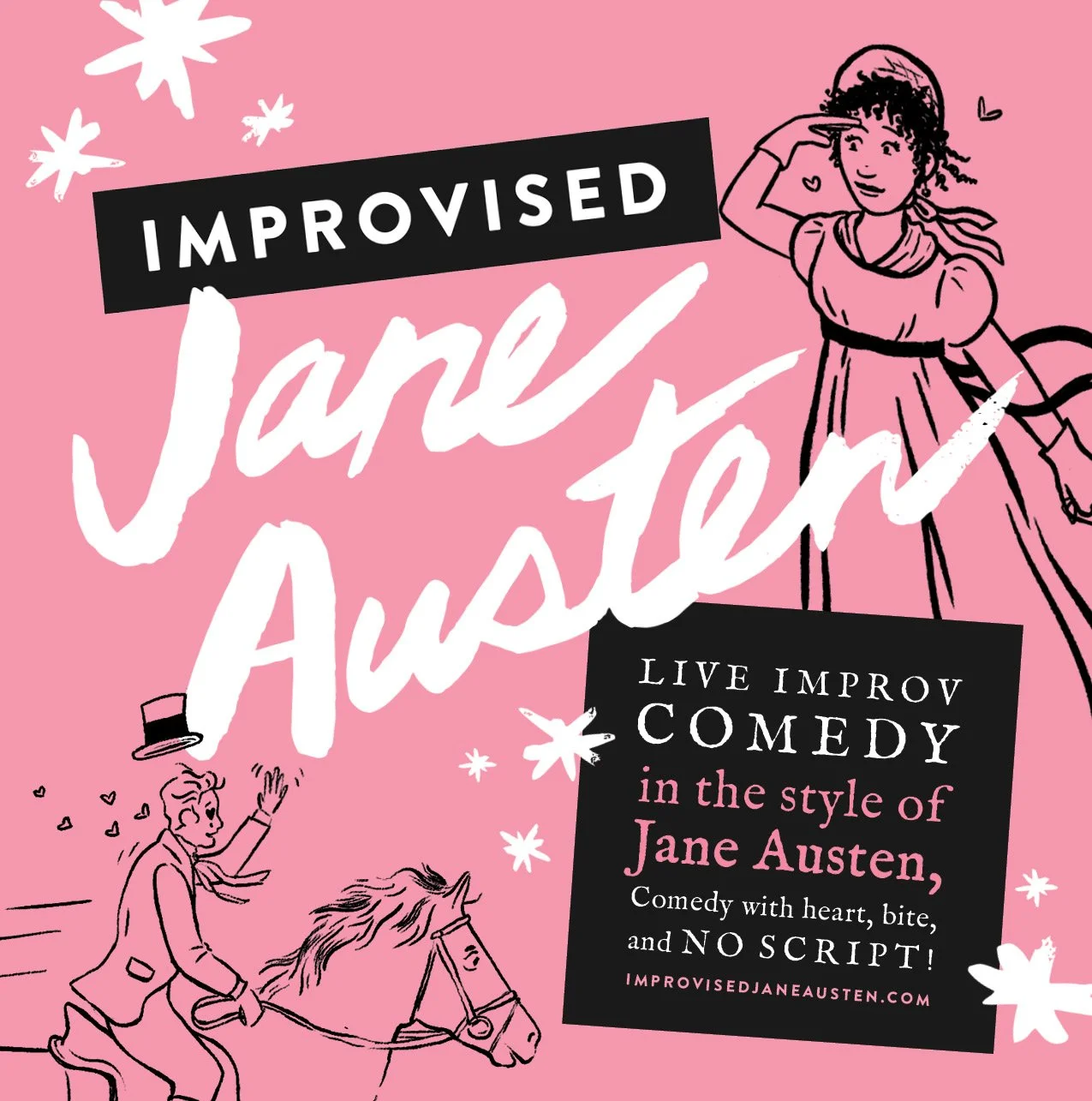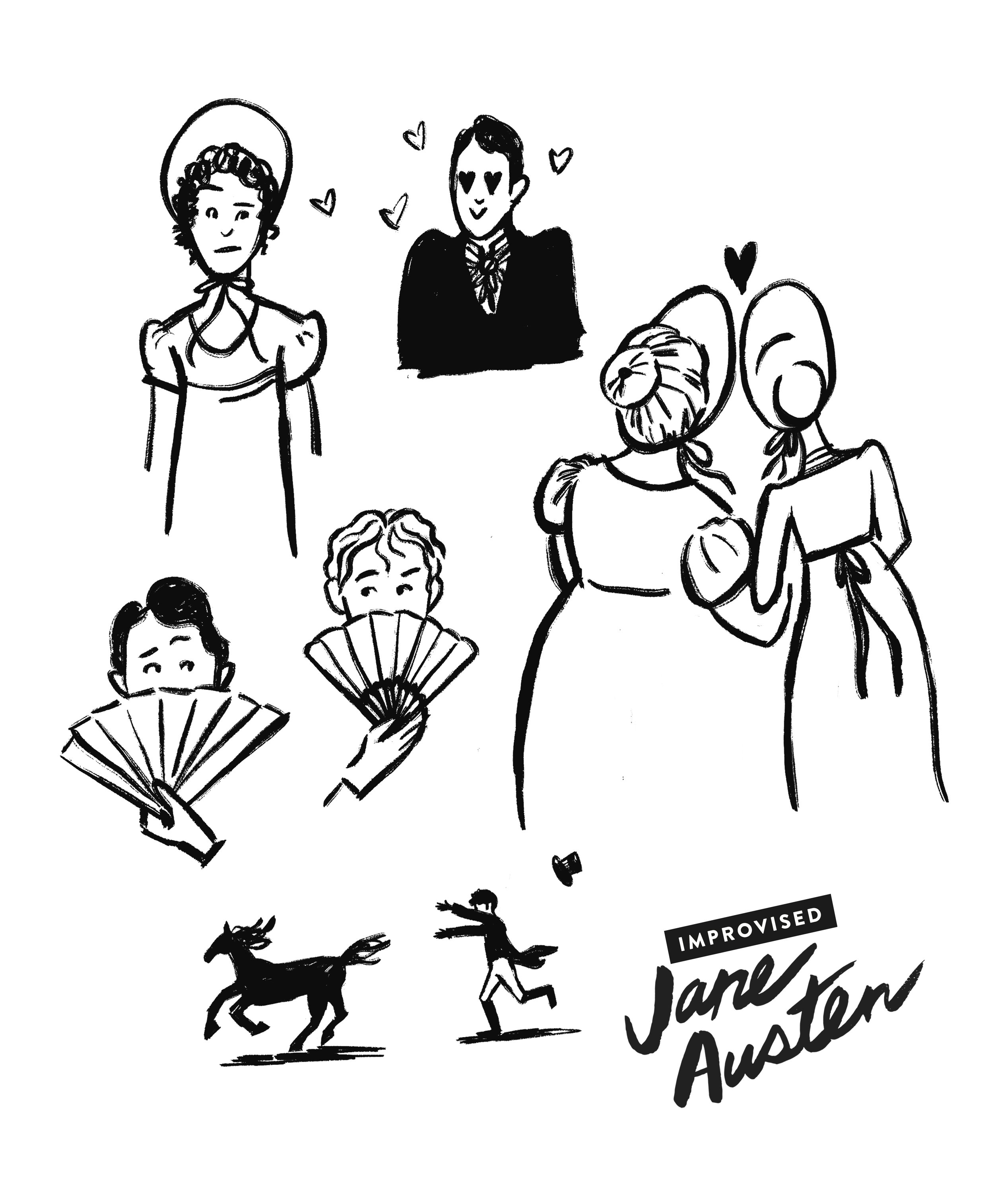 In 2019 I did a brand refresh for long-running improv team Improvised Jane Austen to increase legibility, consistency, and a sense of modern, un-stuffy dynamism. Since then, we’ve continued with the new branding, and I’ve loved making posters, digital graphics, swag, and illustrations that fit our new vibe!